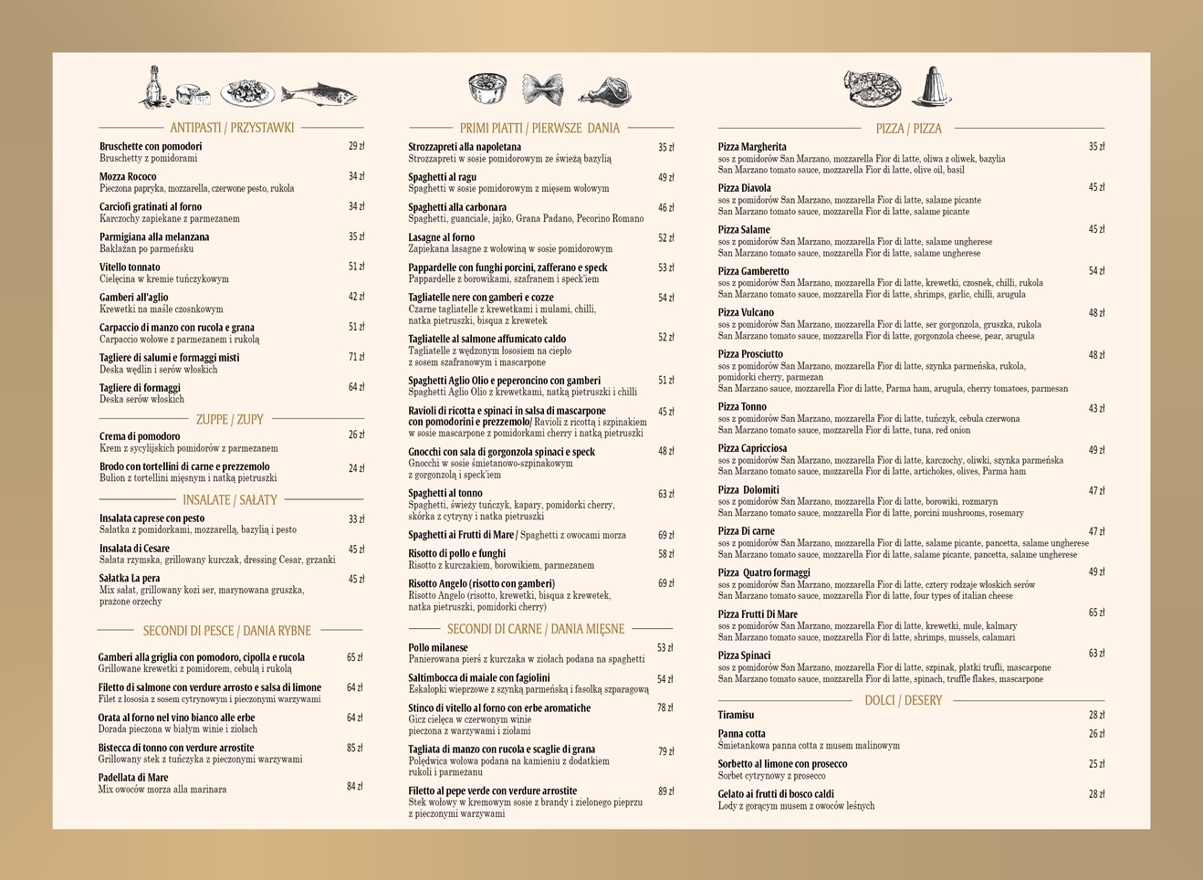 Poznaj nasze Menu i udaj się z nami w kulinarną podróż po Półwyspie Apenińskim. Serwujemy dania przyrządzane z duszą i pasją, na najwyższej jakości składnikach, sprowadzanych bezpośrednio z Włoch.